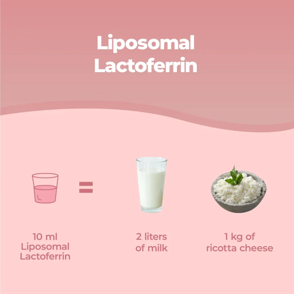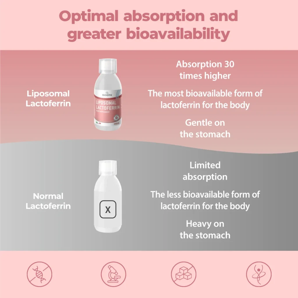 When you take traditional Lactoferrin supplements in the form of tablets or capsules, you are absorbing only a fraction of the amount of Lactoferrin indicated on the product. This is due to the erosion of much of the dose in the hard digestive process. What enters the bloodstream has only a very short time within it can be absorbed. The result is that more than 90% of the active content of Lactoferrin in tablets and capsules is expelled from your body. Liquid Liposomal Lactoferrin is instead produced with an innovative technique that allows a greater absorption of Lactoferrin by our body.